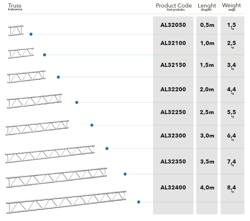 The AL32 truss is a lightweight yet durable aluminium element, ideal for stages, trade show booths, and event structures. With a 50×2 mm main tube and 20×2 mm braces, it’s available in lengths from 0.5 to 4.0 m, perfect for building roofs, LED screen frames, and decorative installations. Certified and quality-checked for reliable performance.